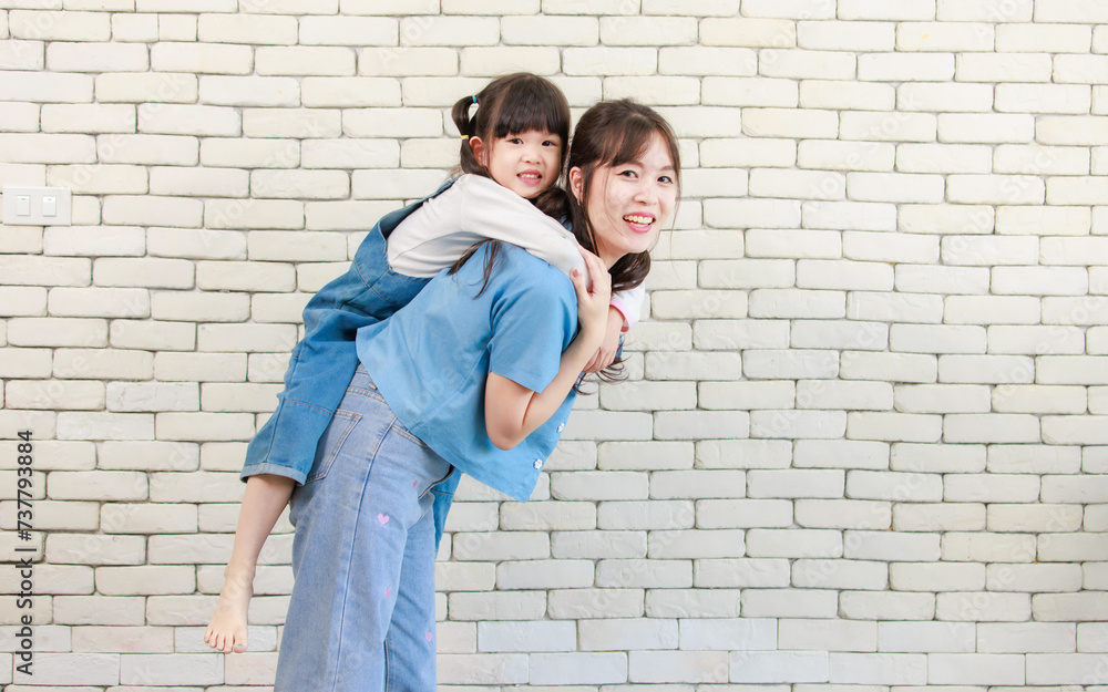 Happy asian beautiful young mother holding cute daughter little girl smiling posing on white brick wall background studio portrait Mother's Day love family parenthood childhood concept.