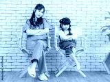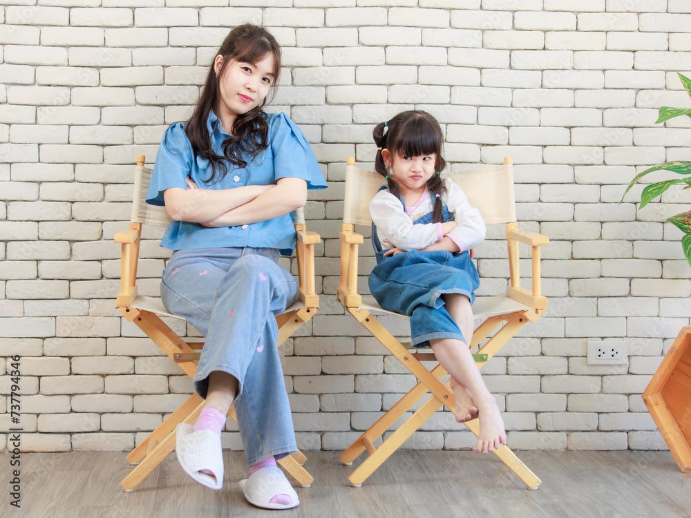 Happy asian beautiful young mother cute daughter little girl posing smiling and sitting on chair, white brick wall background studio portrait Mother's Day love family parenthood childhood concept.