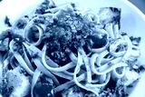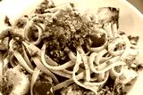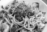 Linguine con delizioso ragu di pesce, pasta italiana, cibo mediterraneo