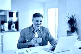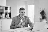 Smiling happy older mature middle aged professional man drinking coffee looking at computer sitting at kitchen table, using laptop hybrid working, elearning, browsing online relaxing at casual home.