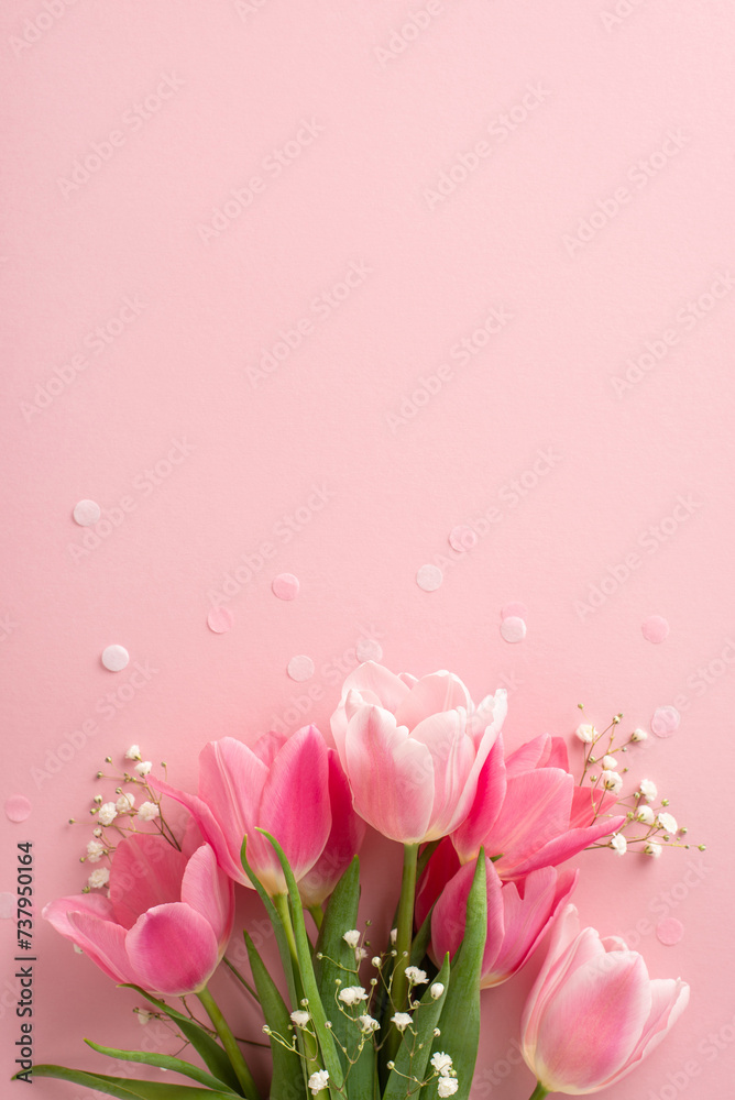 Women's Day charm: vertical top view of abundant tulips with gypsophila, decorative confetti on a gentle pink base, with a clear space for text or advertising