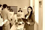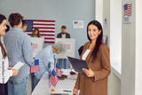 Portrait of American female poll worker. Happy beautiful young brunette woman in suit standing at US ballot station, holding clipboard, looking at camera and smiling. Voting, election concept