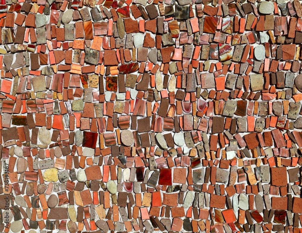 Mosaic made of red shades pebbles and fragments of brick on concrete backdrop. Detail. Background and texture.
