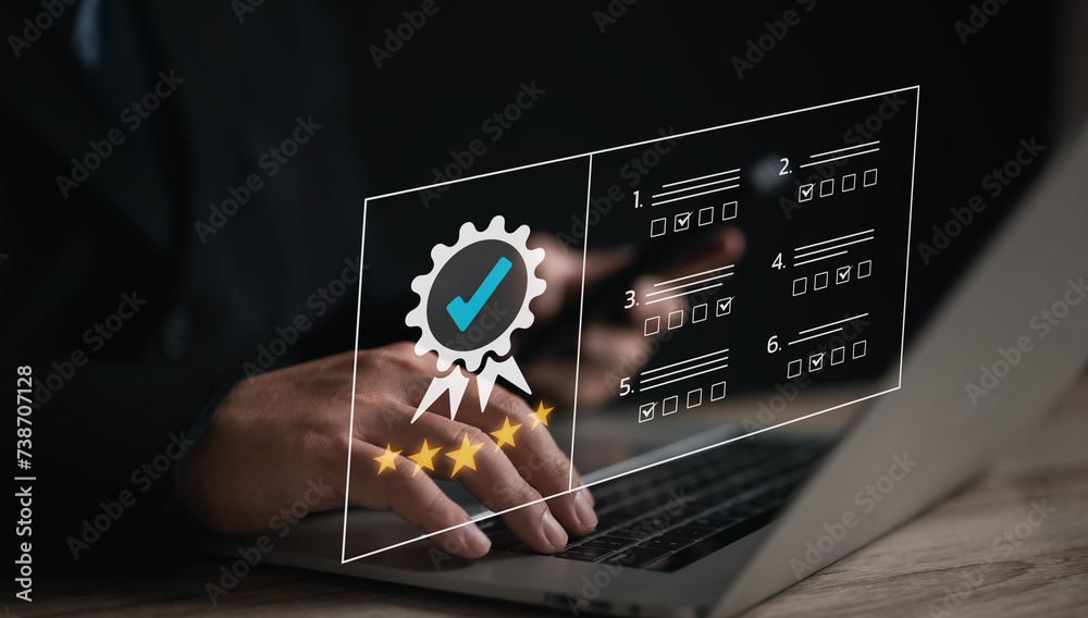 Concept of guarantee standards iso certification and standardization service quality and assurance : Businessman Is using finger touching for certify with five star after he has verified it.