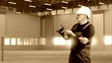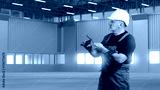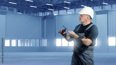 Electrician man inside hangar. Installation of wiring in empty industrial building. Builder man is preparing to replace electrical equipment. Electrician in hardhat cuts wire with scissors
