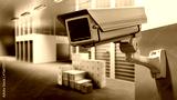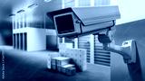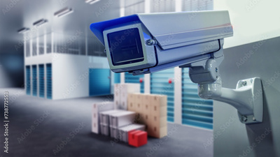 CCTV camera in warehouse. Video surveillance near storage rooms. CCTV equipment for enterprises. White security camera. Corridor with storage rooms is blurred. CCTV device for territory security