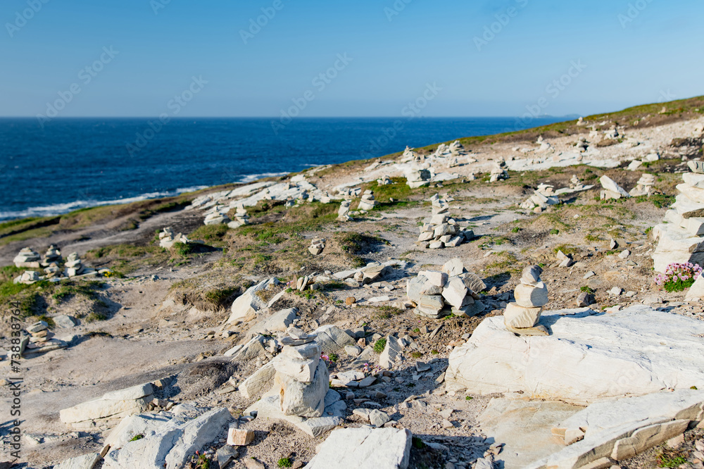 Stones stacks at Malin Head, Ireland's northernmost point, Wild Atlantic Way, spectacular coastal route. Numerous Discovery Points. Co. Donegal