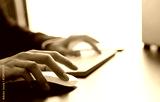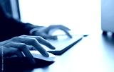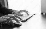 Business manager hand using on white mouse with clicking and its apps for customer support, including email, chat, and communication.