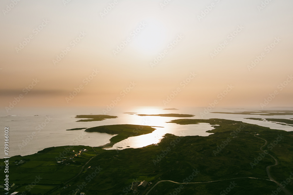Sunset view of Ardmore and Turbot islands from famous scenic Sky Road, 15km looped drive starting in Clifden with numerous brilliant viewing points, Wild Atlantic Way, Connemara, Ireland.