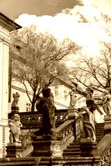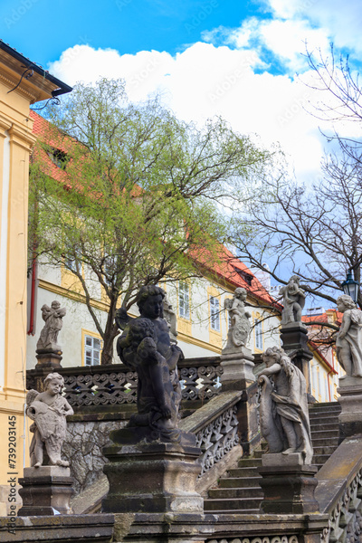 Stairway with baroque statues near Loreta Monastery in Prague, Czech Republic