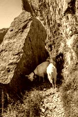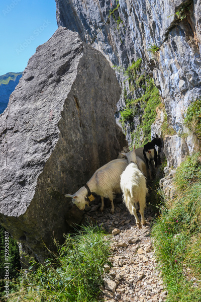 White goats with bell grazing in the Swiss Alps, near Appenzell in the Alpstein mountain range, Ebenalp, Switzerland