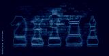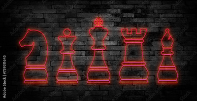Neon chess board game on black brick wall. Strategy, growth business, economy, finance and success concept.