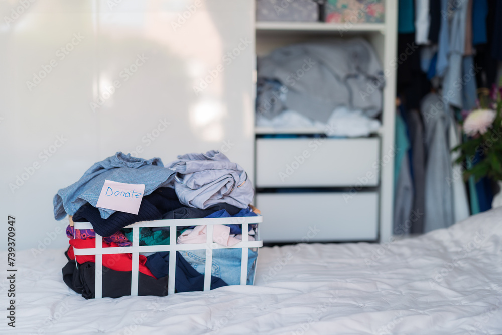 A basket of selected clothes for donating to a Charity shop standing on the bed. Decluttering Clothes, Sorting, And Cleaning Up. Reuse, second-hand. Conscious consumer, sustainability. Selective focus