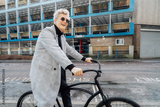 Stylish male in checked coat and sunglasses riding on his retro bicycle on the street with parking buildings. Neutral carbon footprint transportation. Green eco friendly mobility sustainable transport