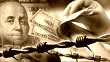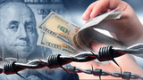 Hands with money behind barbed wire. Dollar bills. Financial sanctions concept. Prohibition on making payments. Cash. Economic sanctions. Prohibition on financial transactions. Paper money