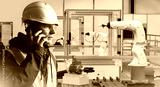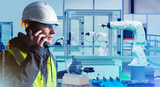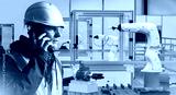 Man in high-tech production facility with robots. Industrial specialist makes phone call. Hand manipulator and industrialist. Man factory engineer calls contractor. Worker servicing industrial robots