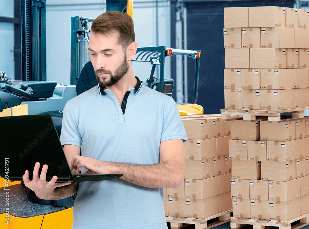 Man is storekeeper with laptop. Young businessman near cardboard boxes. Guy is fulfillment specialist. Storekeeper in charge of fulfilling goods. Man warehouse owner with parcels. Logistic storage