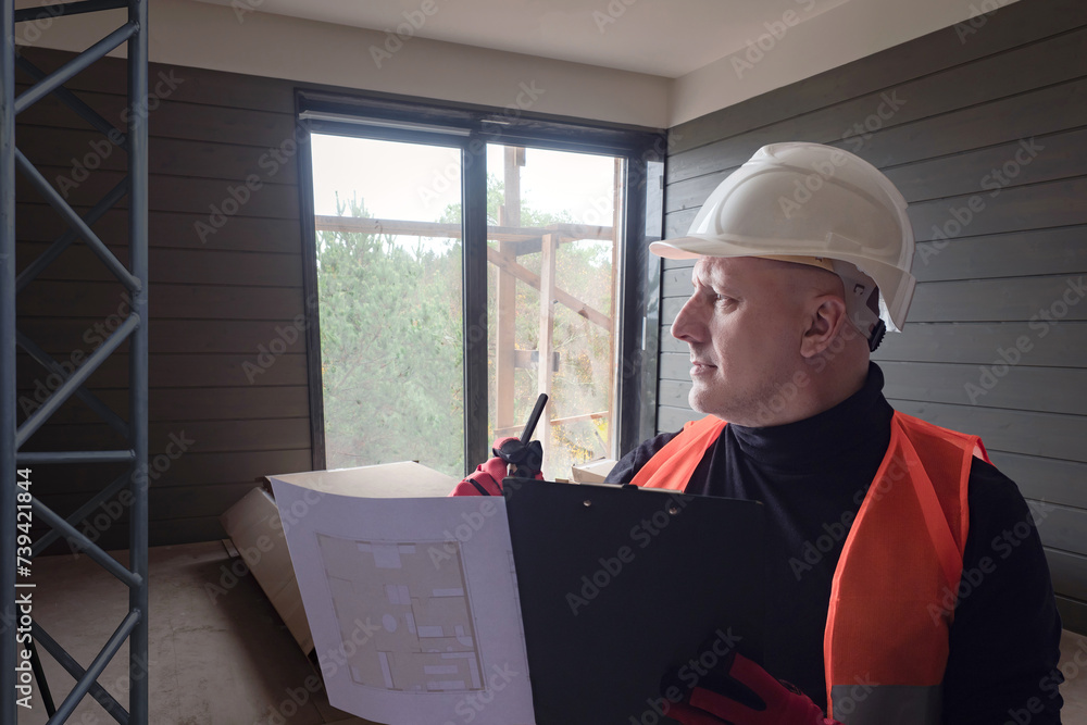 Man builder in building. Engineer with architectural drawings. Builder in hardhat. Architect man inspects premises. Builder makes marks on room-by-room plan. Foreman from construction company