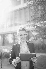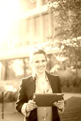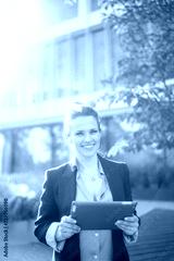 smiling woman worker in business district using tablet PC