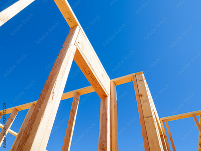 Framing of exterior, interior walls on traditional timber house new build construction, joints, post, beam connection of medium size single family residential home, Dallas, Texas, clear blue sky