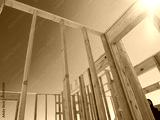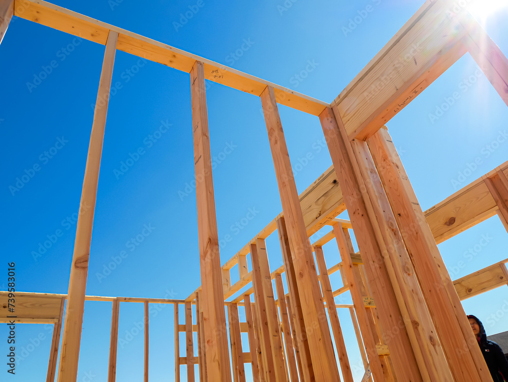 Framing of exterior, interior walls on traditional timber house new build construction, joints, post, beam connection of medium size single family residential home, Dallas, Texas, clear blue sky