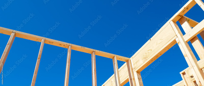 Panorama wooden exterior interior walls framing house, rough openings for doors and windows on newly set foundation of medium size single family residential home in Dallas, Texas, clear blue sky