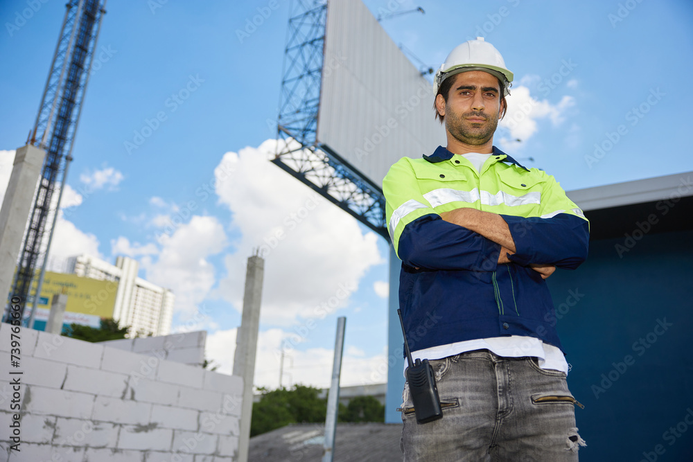 portrait worker or architect standing and crossed arms pose at construction site