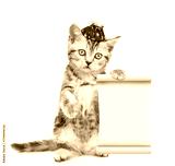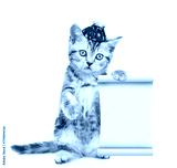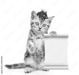 Sad sick kitten with ice bag or ice pack on his head shows empty list. Isolated on white background