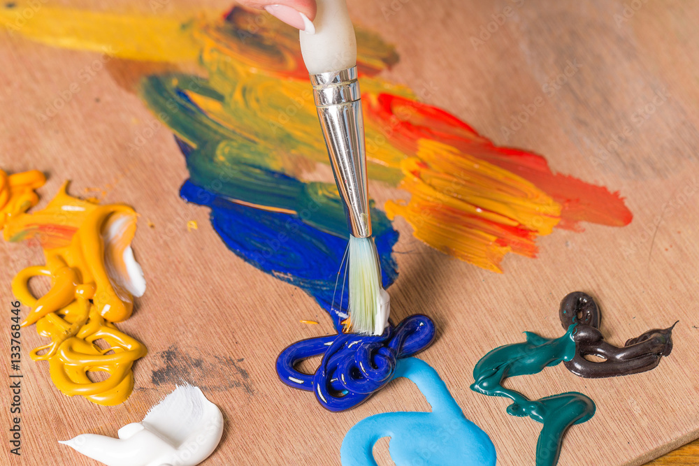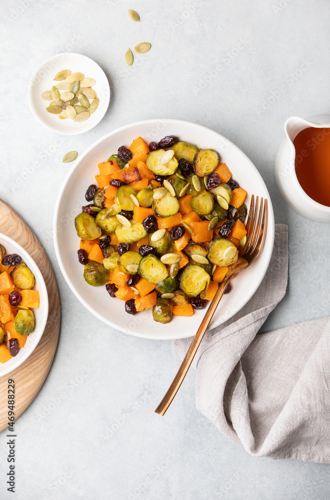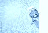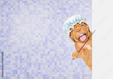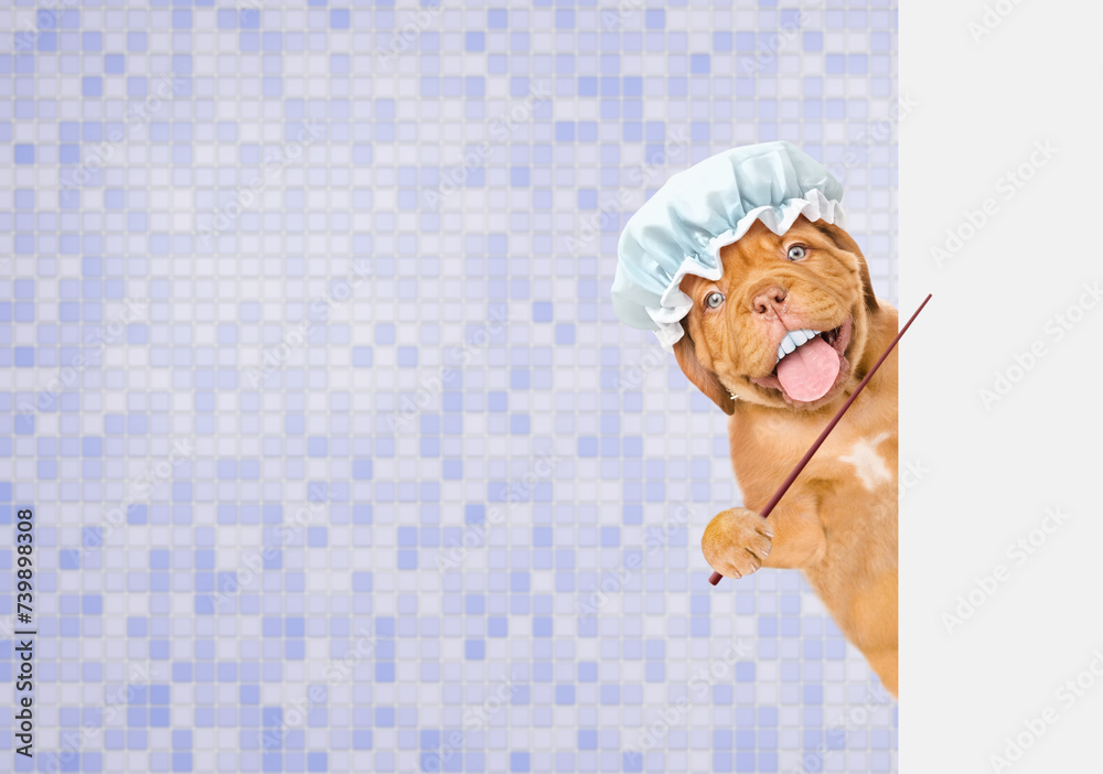 Happy mastiff puppy wearing shower cap with big funny teeth, with towel on it head peeking out from behind empty white banner in the bathroom at home. Empty space for text