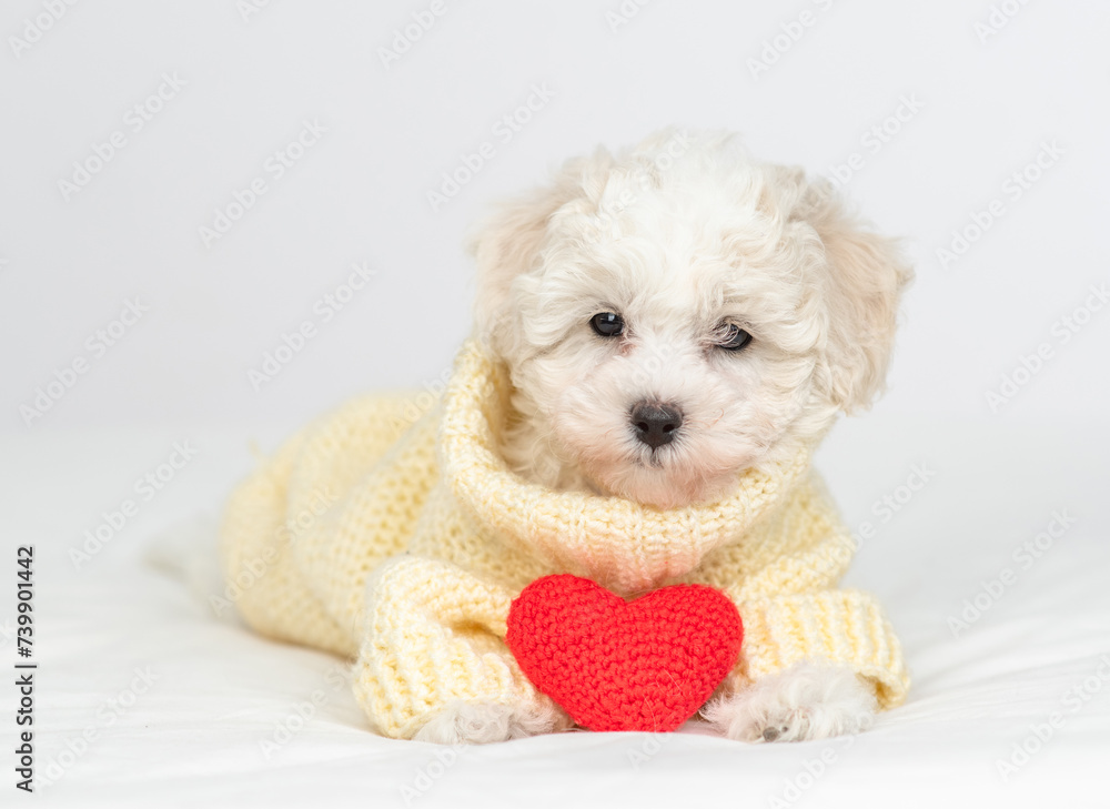 Cute lapdog puppy wearing warm sweater lying on a bed at home with red heart. Valentines day concept