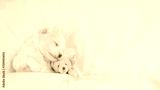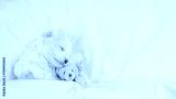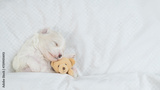 Cute white Lapdog puppies sleeps with toy bear under warm blanket on a bed at home. Top down view. Empty space for text