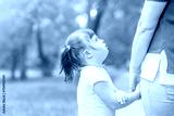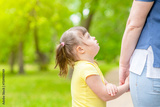 Little girl with syndrome down holds mother's hand at sunny summer park