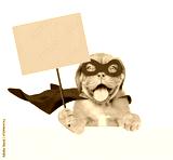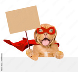 Funny Mastiff puppy wearing superhero costume holding blank banner mock up on wood stick and looking above empty white banner. Isolated on white background