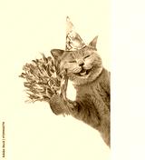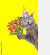 Happy cat wearing party cap holds bouquet of tulips and looks from behind empty white banner. Isolated on yellow background