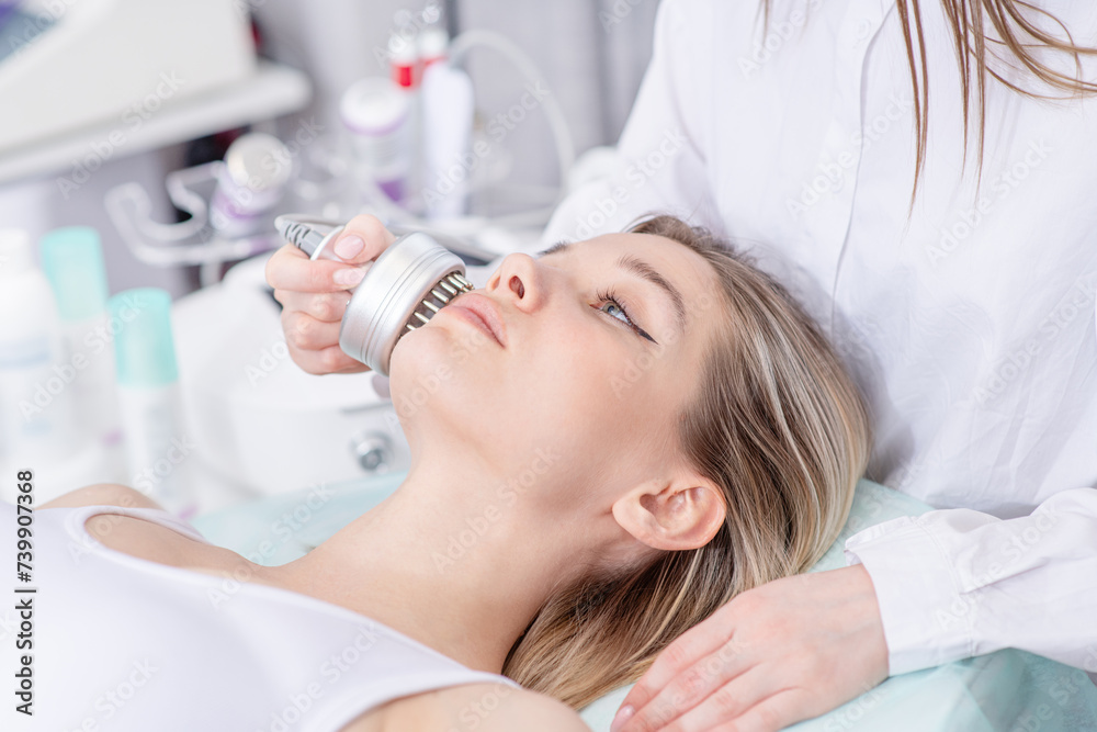 Pretty young blonde woman client lying with closed eyes and getting stimulating beauty facial treatment during rf-lifting procedure at clinic. Radiofrequency face lifting. Hardware antiaging procedure
