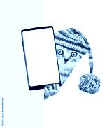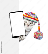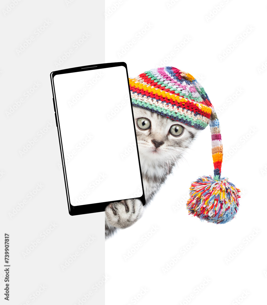 Cute kitten wearing warm hat with pompon holds smartphone with white blank screen in it paw above empty white banner. isolated on white background