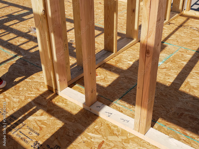 Oriented Strand Board OSB sub flooring and interior wall framing of new house construction, timber framing with posts beams studs, sheets cover joists with subfloor wood screws, Dallas, Texas