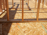 OSB sub flooring sheets cover, attach to the joists with wood screws Oriented Strand Board plywood, timber framing with posts beams studs of new house construction, interior wall framing, Texas