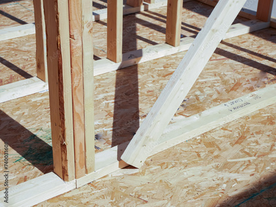 OSB sub flooring sheets cover, attach to the joists with wood screws Oriented Strand Board plywood, timber framing with posts beams studs of new house construction, interior wall framing, Texas
