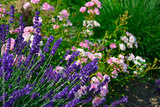 róża i lawenda, lawenda wąskolistna - lavender, (lavandula angustifolia, Rosa), różowe róże i fioletowa lawenda, pink garden roses, flowerbed, ogród kwiatowy