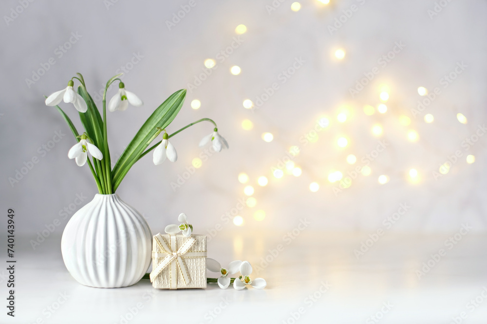 snowdrops flowers and gift box on table, abstract light background. white snowdrops, symbol of spring season. romantic gentle nature image. hello spring, 8 march, Mother's day concept. copy space