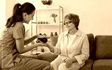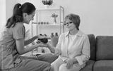 Friendly young nurse or physiotherapist holding spiky rubber ball and doing hand massage to happy smiling senior woman who is sitting on sofa in retirement home. Old age, health, physiotherapy concept