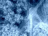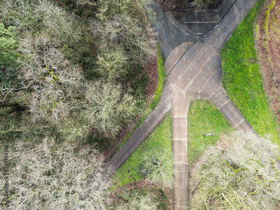 Drone top down view of an empty asphalt track and rural road seen near the heart of the famous Sherwood Forest in the UK. The path is frequented by walkers and cyclist.
