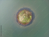 Drone top down view of a small, round aquatic bird sanctuary seen on a fresh water lake in the UK. A central large ceramic ornament can be seen in the middle of the island.