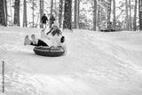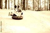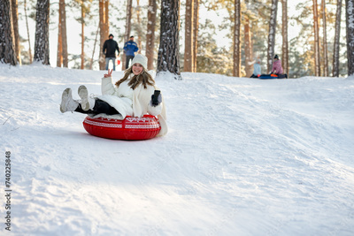A young girl is tubing in a winter snowy forest with beautiful sunlight