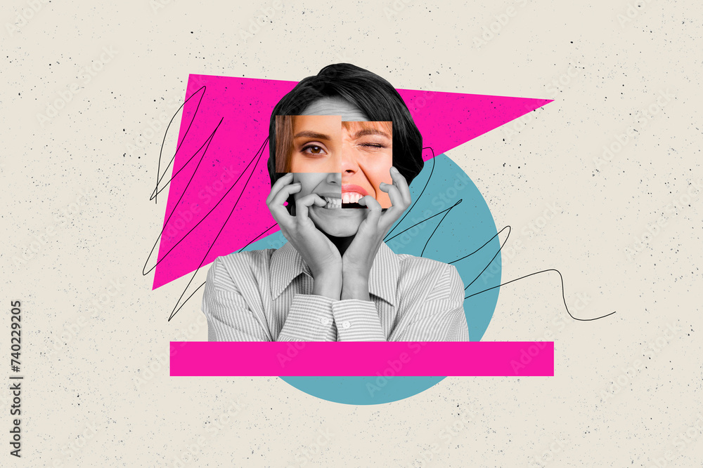 Abstract composite concept photo collage of suffering anxious woman with mental issues biting fingers isolated on drawing background