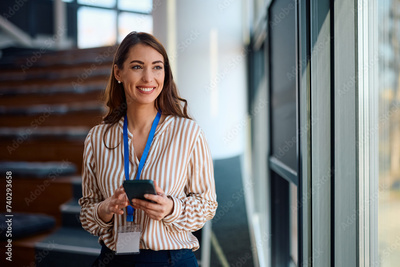 Happy businesswoman texting on cell phone while looking through the window in conference hall.