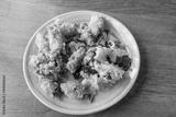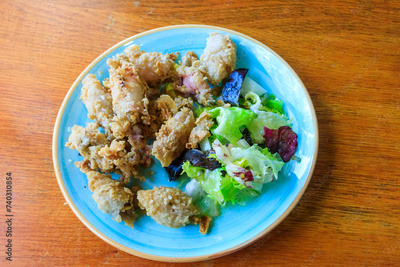 Crispy deep fried baby octopus served with salad on wooden table. Top view