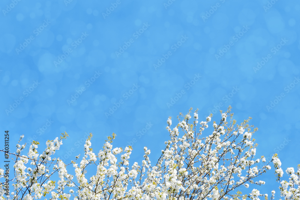 blooming branches white blossoms, against backdrop of blue sky, concept spring season, Spring Celebrations, environmental, nature in detail