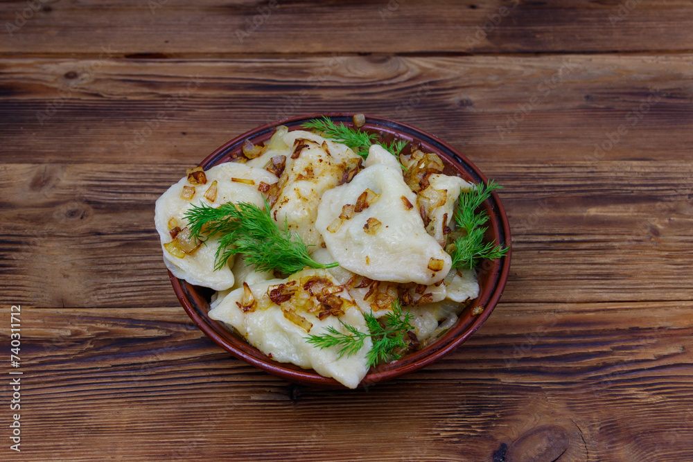 Delicious homemade dumplings on a wooden table